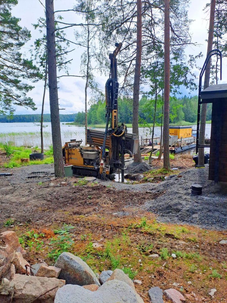 Vesikaivon poraus onnistuu myös saaritonteilla. Tällä viikolla on porattu vesikaivoja loma-asunnoilla Päijänteen syleilyssä. Suomen toiseksi suurimman järven selän ylitse porauskalusto on kulkenut lautan avulla. Mökkeilijöiden ei tarvitse rahdata juomavettä vesireittejä pitkin tai pelätä heittävänsä saunankiukaalle sinilevää, kun pihassa on oma porakaivo!